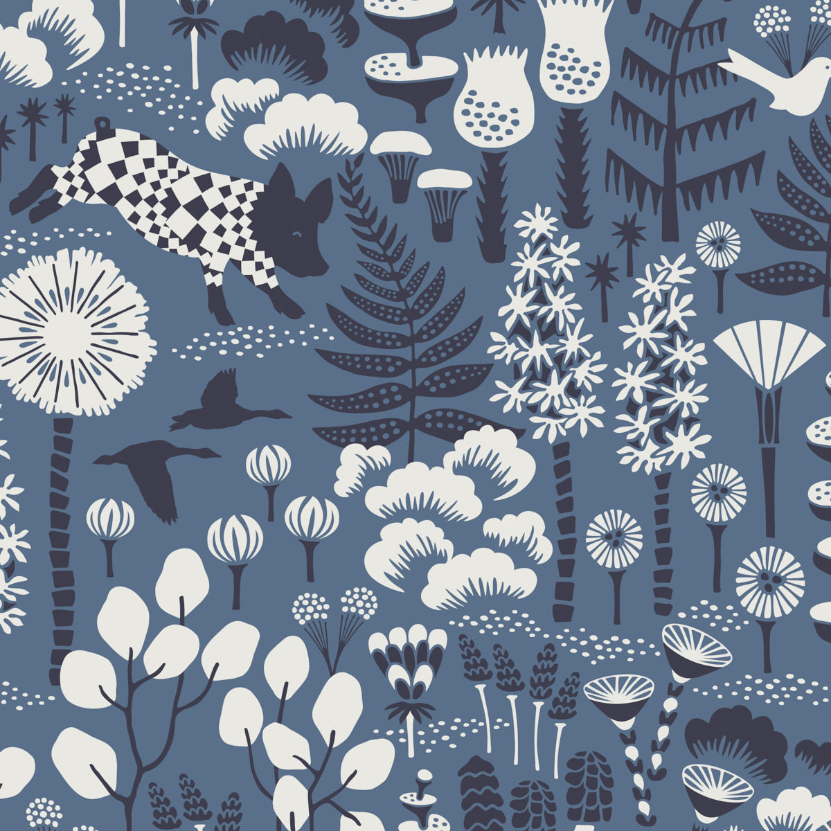 This sensational blue-colored wallpaper designed by Hanna Werning for Boråstapeter adds a stylish dose of cheer to every space. Hoppmosse depicts happy-go-lucky piglets frolicking among feathery moss and soaring geese flying high above fantastical forests. This product is FSC Certified. Available in North America exclusively through Schumacher.
